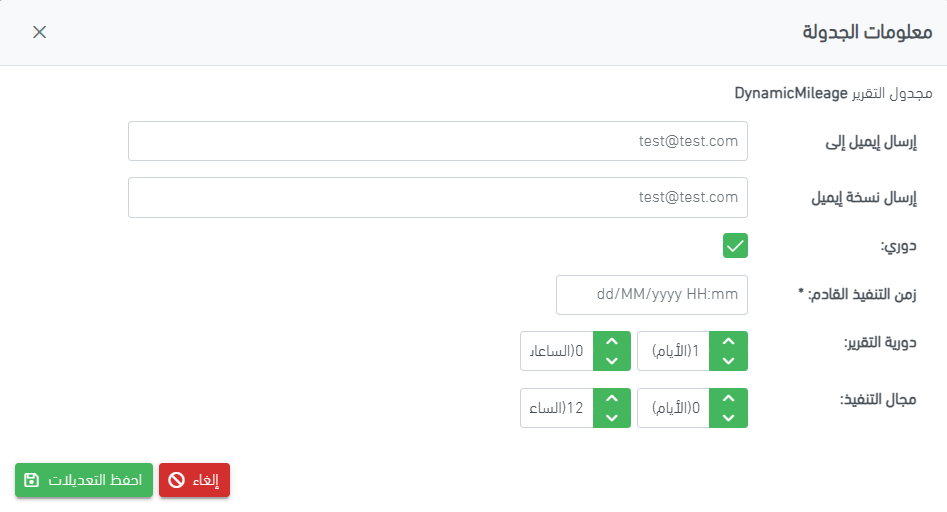 على سبيل المثال: إذا كنت بحاجة إلى تلقّي التقرير المجدول كل يوم عن آخر 12 ساعة، فستحدد في “زمن التنفيذ القادم” الوقت الذي تريد فيه استلام التقرير المجدول ثم تختار 1 يوم عند إعداد خيارات “دورية التقرير” و12 ساعة عند إعداد خيارات “مجال التنفيذ” كما هو موضح في الصورة أدناه: