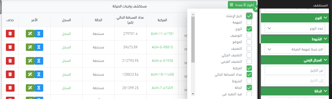 لتتبع أوسع لمهام الصيانة، أضفنا عموداً اختيارياً يتيح لك عرض قيم عداد المسافة وتتبعها بسهولة أثناء استكشاف مهام الصيانة. توفر هذه الإضافة القيّمة قدراً كبيراً من المرونة والشمولية للشركات التي تدير أنشطة الصيانة الخاصة بها.