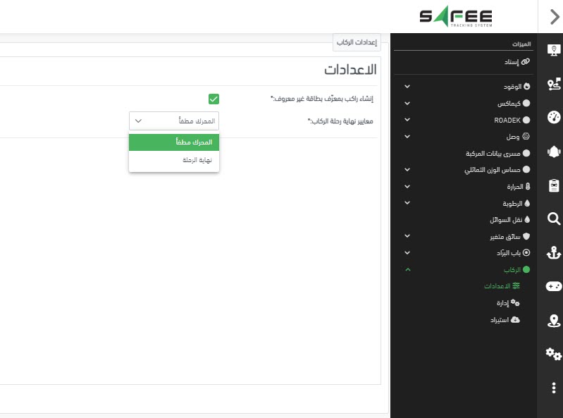 a. الإعدادات: هنا يمكنك اختيار ما إذا كنت تريد أن يقوم النظام بإدخال راكب جديد في النظام عند استلام معرّف غير موجود بين معرّفات الركاب المضافة بالفعل. يمكنك أيضاً ضبط المعايير التي سيعتبر النظام عندها أن رحلة الركاب قد انتهت. الخيارات المتاحة هي “المحرك مطفأ” (أي عندما يتم إيقاف محرك المركبة) و”نهاية الرحلة” (أي إذا تم إنهاء الرحلة لأسباب أخرى غير إيقاف المحرك).