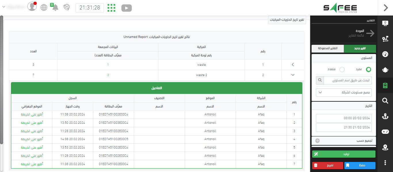 يعرض التقرير بطاقات RFID المختلفة (معرّفات البطاقات) التي قامت المركبة بمسحها طوال الفترة المحددة بالإضافة إلى الأوقات/المواقع الذي تمت فيه قراءتها.