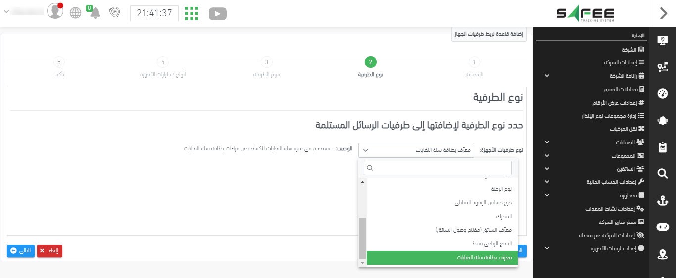يقوم النظام تلقائياً بالتقاط بيانات النفايات وربطها بالمركبات المعنية. كل ما تحتاجه هو إسناد ميزة إدارة النفايات للمركبة المستهدفة وإضافة قاعدة طرفيات الأجهزة المقابلة كما هو موضح أدناه.