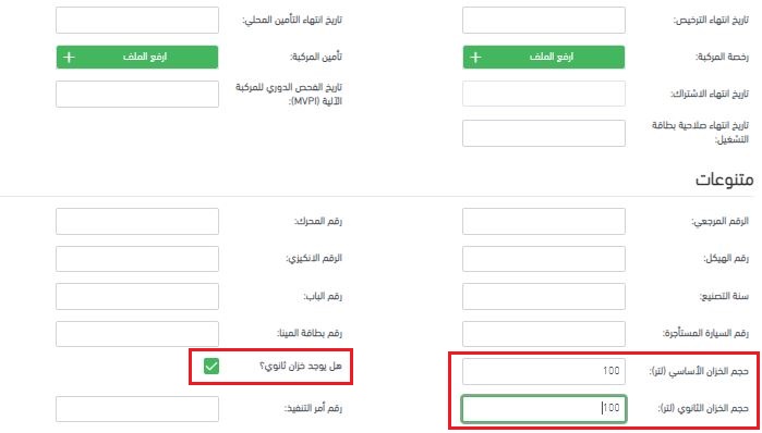 - صفحة خصائص المركبة: قم بتعديل معلومات الخزان الخاصة بمركبتك وحدد خزاناً ثانوياً. عند حفظ الإعدادات، سيعكس “حجم الخزان” المعروض الحجم الإجمالي للخزانين.