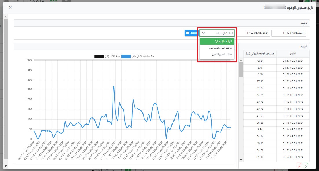 - مولد الإنذار تعبئة/تفريغ الوقود: يمكنك ضبط مولدات الإنذار لمراقبة الخزان الرئيسي، الخزان الثانوي، أو كليهما.