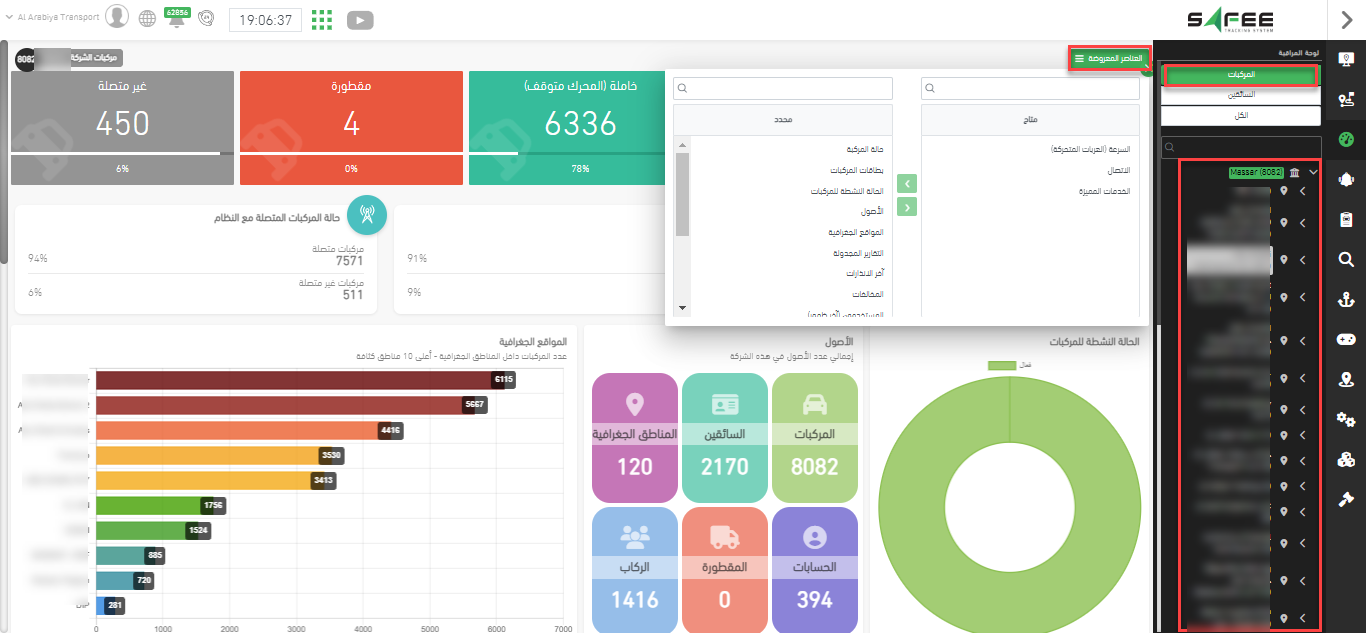 - الكل: تعرض هذه الصفحة معلومات إحصائية عن جميع المركبات والسائقين تحت الشركة. تحتوي على عدة عناصر شاملة حول جميع الأصول مع القدرة على إظهار/إخفاء العناصر. في هذه الصفحة الجديدة، يمكنك النقر على “افتح لوحة المراقبة في تبويب جديد” لعرض اللوحات فقط في صفحة جديدة.