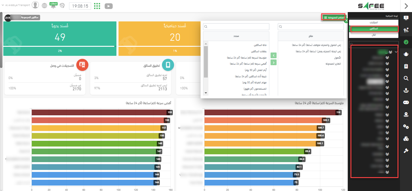 - لوحة مراقبة السائقين: تعرض هذه الصفحة معلومات إحصائية عن السائقين التابعين للشركة. تحتوي على عدة عناصر شاملة حول السائقين مع القدرة على إظهار/إخفاء العناصر. في هذه الصفحة الجديدة، يمكنك النقر على المستوى المستهدف من شجرة مجموعات السائقين في الشريط الجانبي لعرض الإحصائيات حول المستوى المحدد فقط.