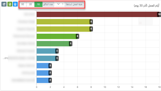 - أيام العمل (آخر 30 يوم): سيتم اعتبار اليوم يوم عمل إذا تجاوزت ساعات العمل (التحرك + الخمول والمحرك يعمل) العتبة التي تحددها في إعدادات العنصر (فقط مرر فوق العنصر لعرض الإعدادات). ستُحفظ العتبة التي تحددها لحسابك.