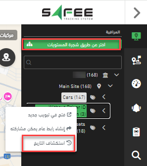 - من شجرة الشركة، انقر بالزر الأيمن على المستوى المستهدف واختر “استكشاف التاريخ” إذا كان عدد المركبات تحت هذا الموقع يتوافق مع الحد الأقصى المسموح به لميزة التاريخ المتعدد للمركبات.