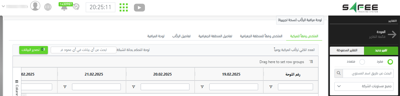الملخص وفقاً للمركبة: يُظهر العدد الكلي للركّاب يومياً لكل مركبة محددة. يُظهر العمود الأخير إجمالي تحركات الركّاب (مجموع كل الأيام).