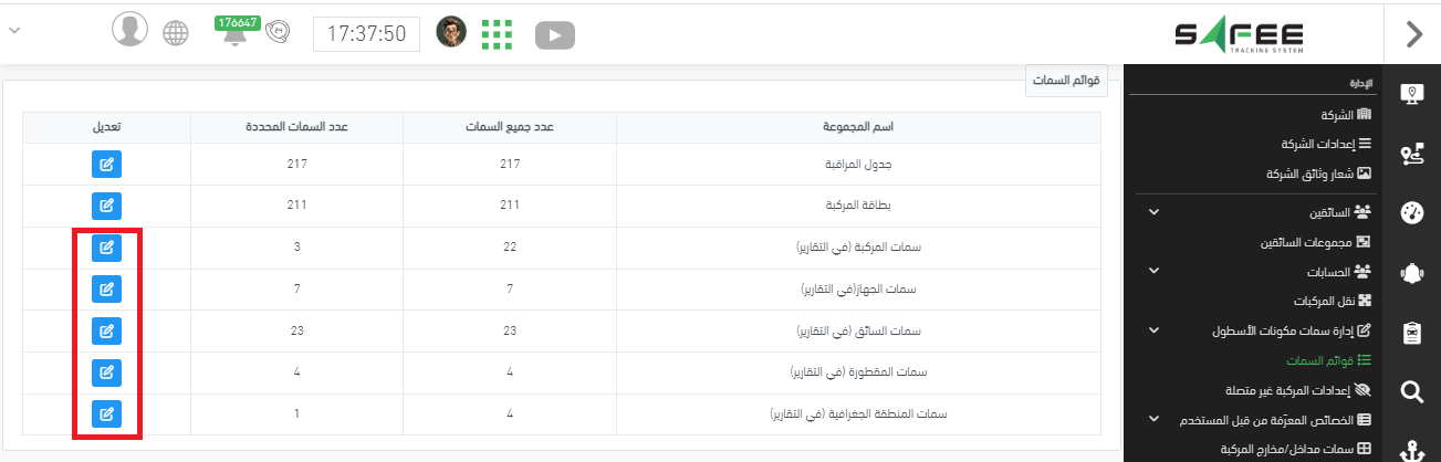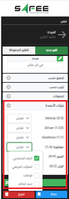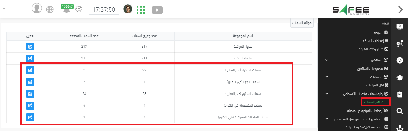 لتسهيل الاستخدام، أضفنا بشكل افتراضي السمات الأكثر شيوعاً، وهي الأرقام (22، 7، 23، 4، 4) التي تظهر في قائمة السمات (للمركبات، الأجهزة، السائقين، المقطورات، المناطق الجغرافية) بالترتيب.