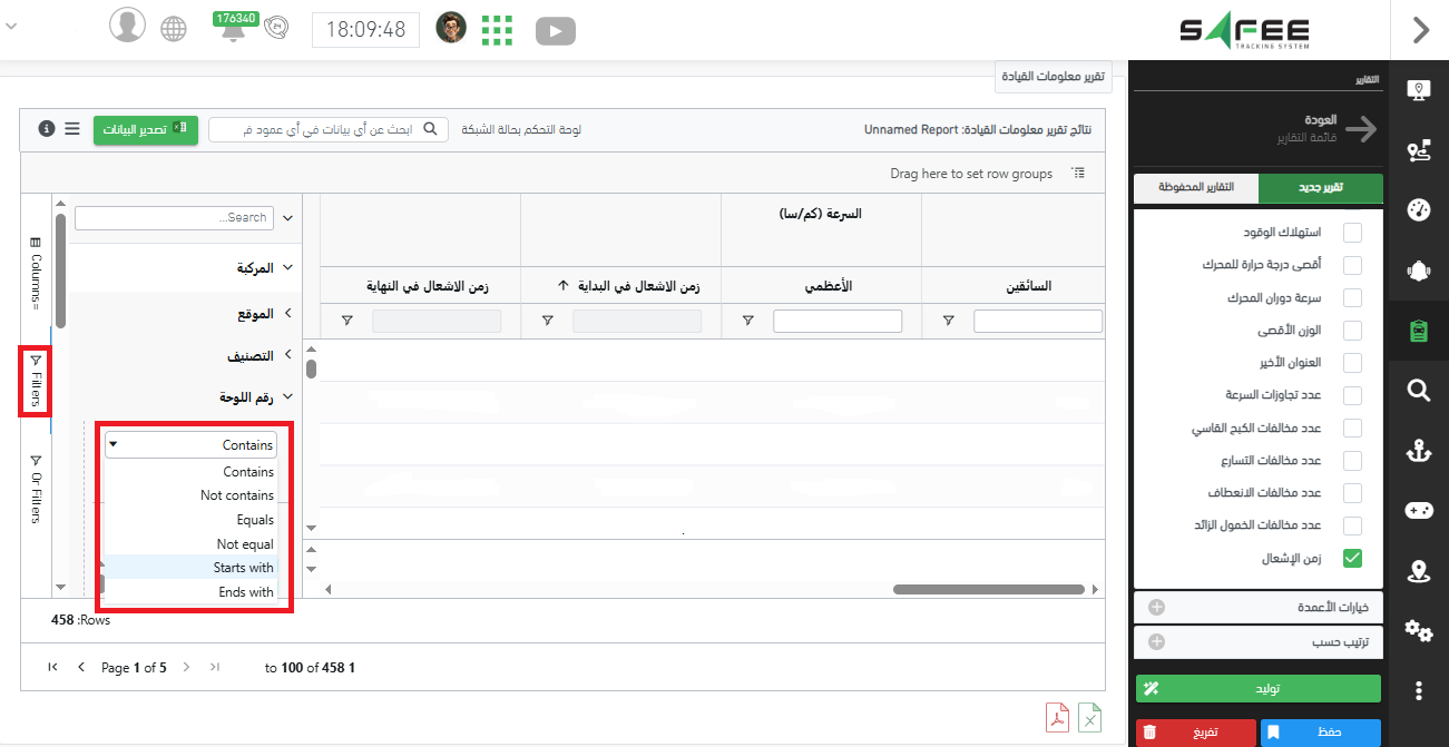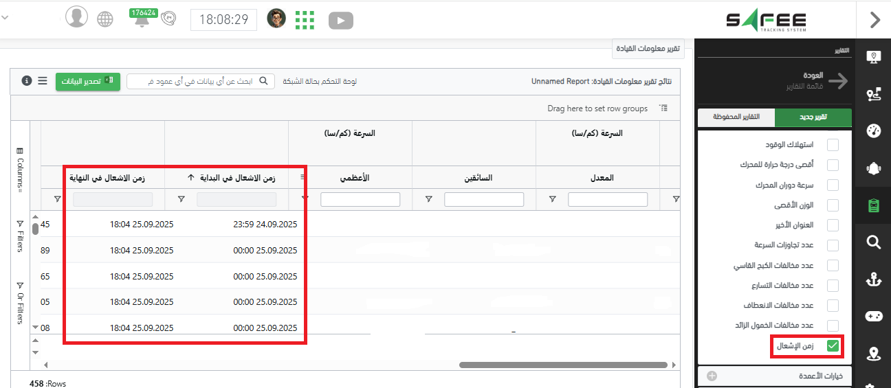 لقد أضفنا عمودين جديدين إلى تقرير معلومات القيادة لعرض وقت تشغيل كل مركبة في بداية المجال الزمني المختار، ووقت التشغيل في نهاية المجال الزمني المختار.