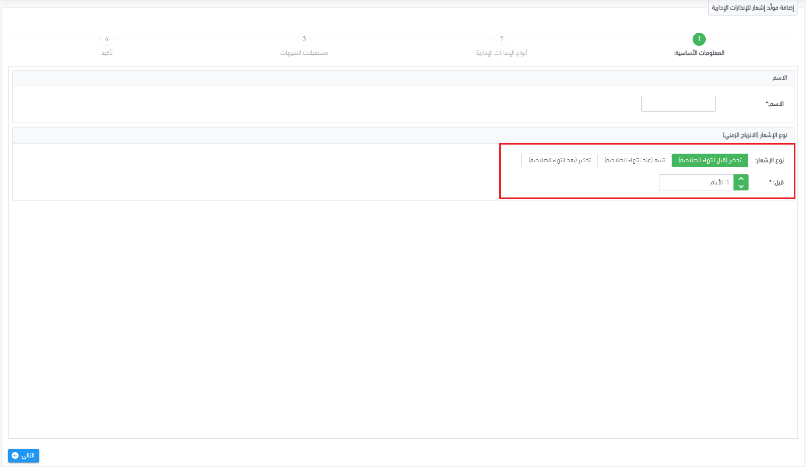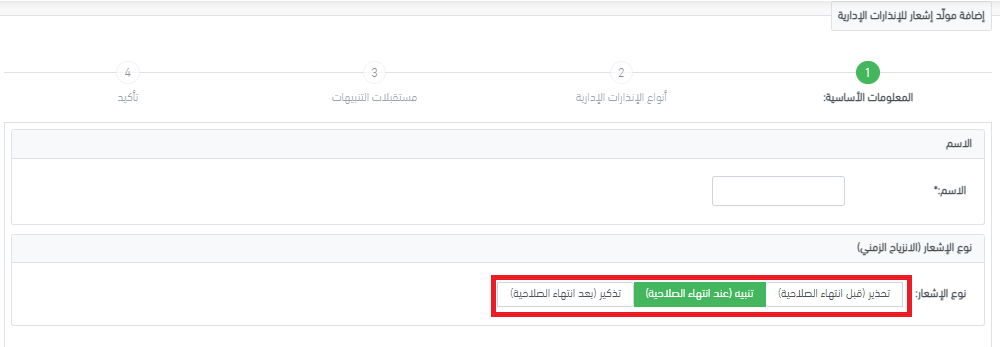 ملاحظة: يُرجى الانتباه أنه يمكنك ضبط نوع واحد فقط من الإشعارات (تحذير، تنبيه، أو تذكير) في كل مرة! أي أن إعداد إشعار لإنذار إداري من خلال معالج الإعداد الخاص به يُمكّنك من ضبط نوع واحد فقط من الإشعارات، حسب اختيارك في الخطوة الأولى.