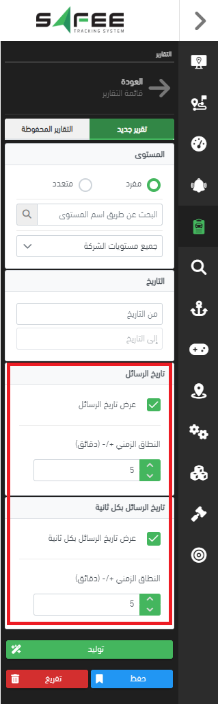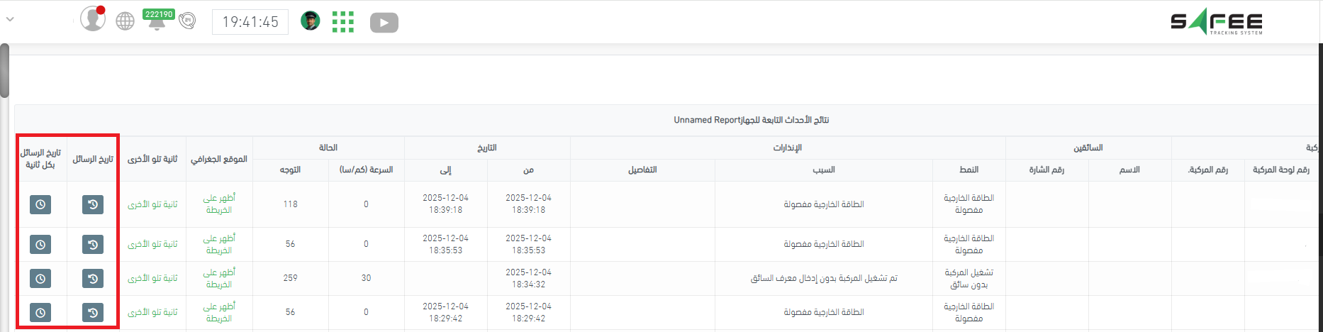 - عند التفعيل، ستتضمن نتائج التقرير عموداً جديداً بعنوان “تاريخ الرسائل” يحتوي على رابط لعرض سجل المركبة.