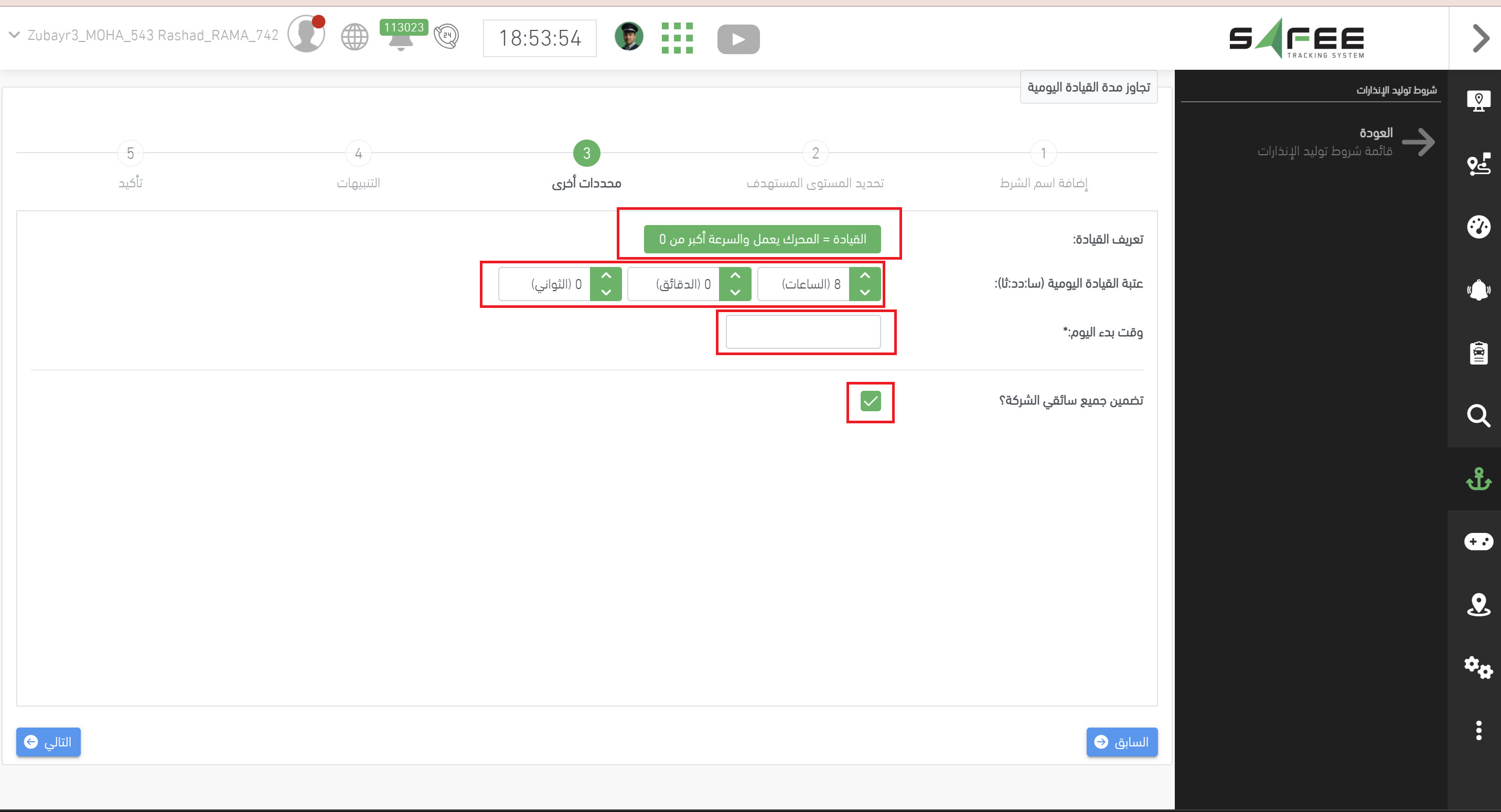 تحديد وقت بداية يوم القيادة: يمكنك تحديد وقت بداية يوم القيادة، حيث يقوم النظام بمراقبة وتجميع زمن القيادة لكل سائق على مدار 24 ساعة بدءًا من هذا الوقت.