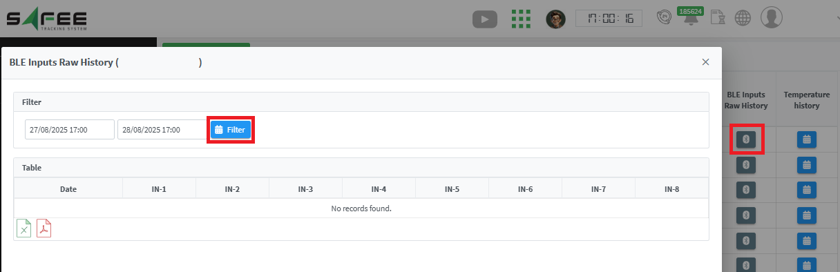 - For each vehicle, click on the Bluetooth icon to show the BLE raw data history