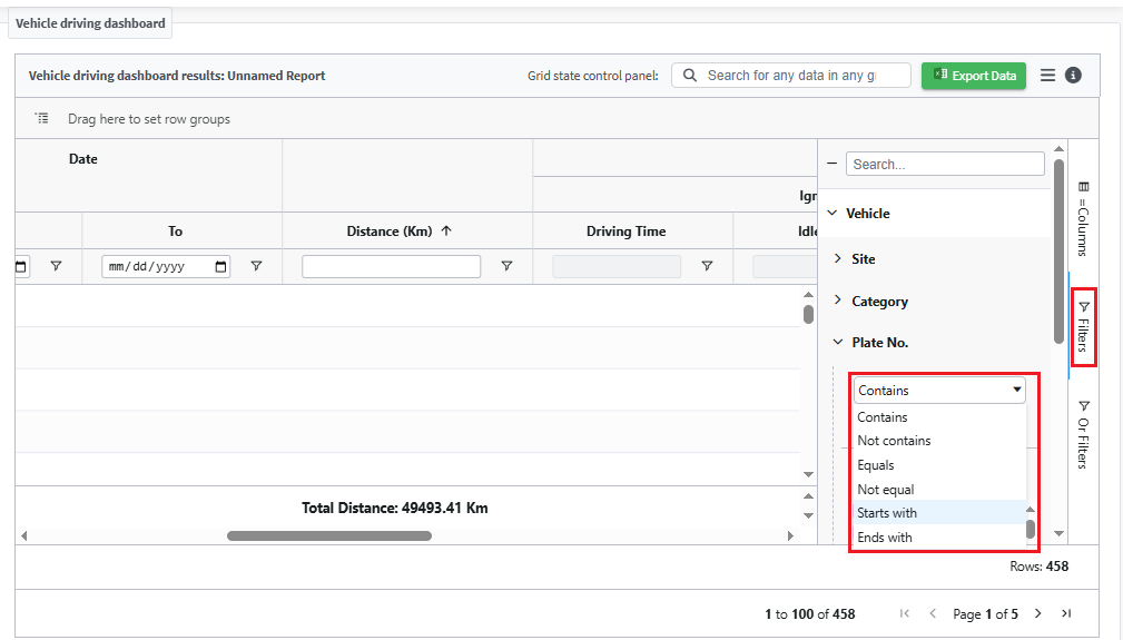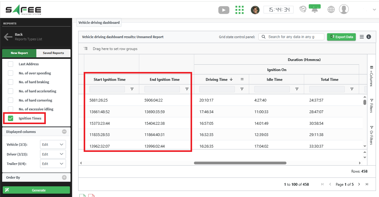 We added two new columns to the vehicle driving dashboard report to show the ignition time of each vehicle at the date/time range beginning and the ignition time of the vehicle at the end of the date/time range. The column is hidden by default, and you need to check it at the input filters to show it at the report output.