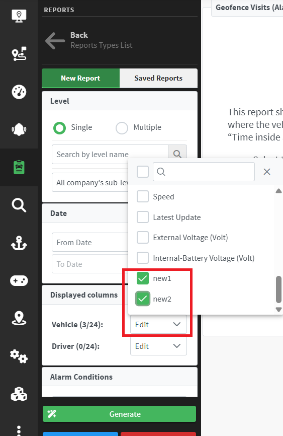 Users can now select user-defined properties for vehicles, drivers, devices, trailers, and geofences when generating reports. This enhancement provides greater flexibility and customization in report creation and output.