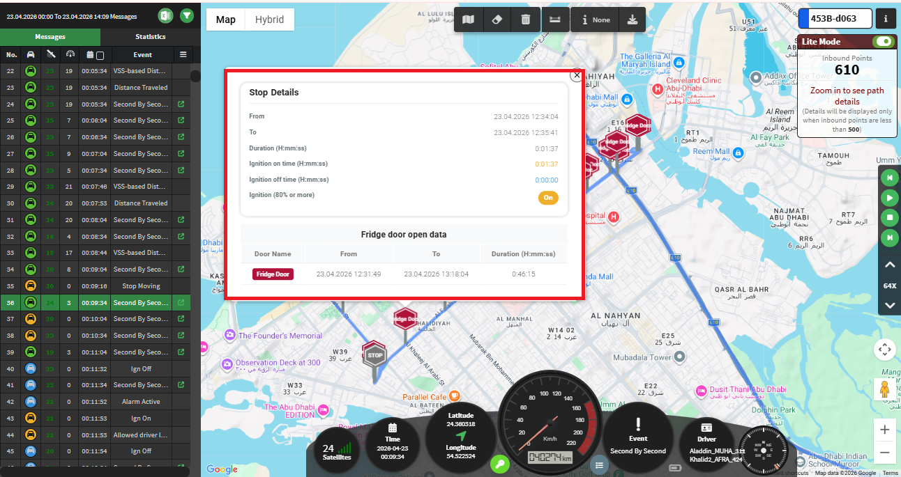 The vehicle history page now shows stops and fridge door activity during the stops -if available- for vehicles with the Fridge Door module.